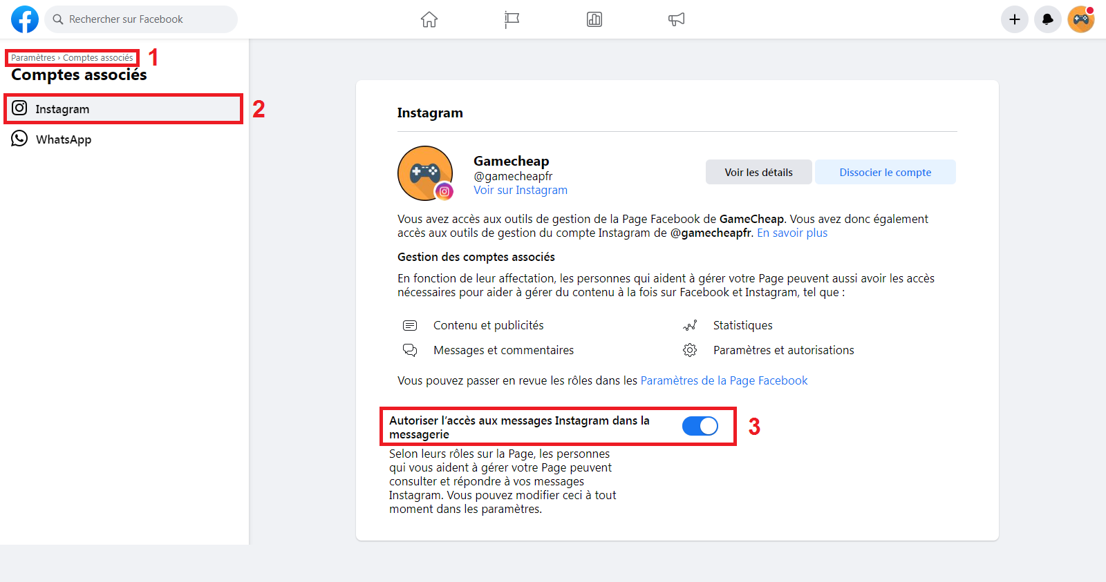 - Autorisez l'accès aux messages Instagram dans la messagerie de votre compte Facebook.